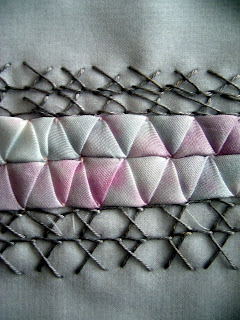 Cannot say I enjoyed this stitch very much, I made a background of hand -dyed silk on organza, in pale greys and pink. I chose a fine grey pearl thread.